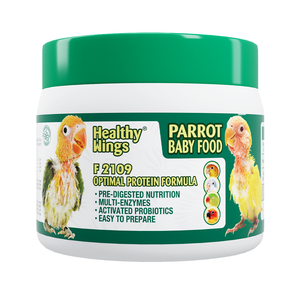 Healthy Wings Parrot Baby Food delivers daily balanced nutrition for juvenile parrots, from hatchling to fledgling. Our balanced, micro-ground formula combines multigrains with probiotics, digestive enzymes and organic acids to support healthy growth.