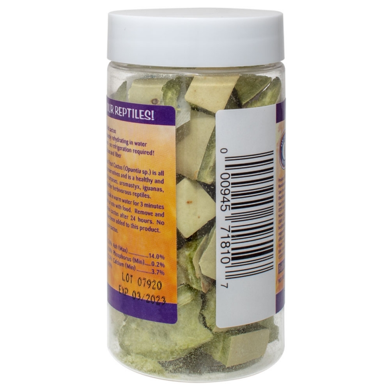 A natural food for all tortoises. The outer spines are removed, the leaves are washed and diced, before being freeze dried. Freeze dreid cactus has a much longer shelf life than fresh and contains the same nutritional value. It can be fed alone or mixed in with salads and other food items. Easily and quickly rehydrates to it’s natural state.
